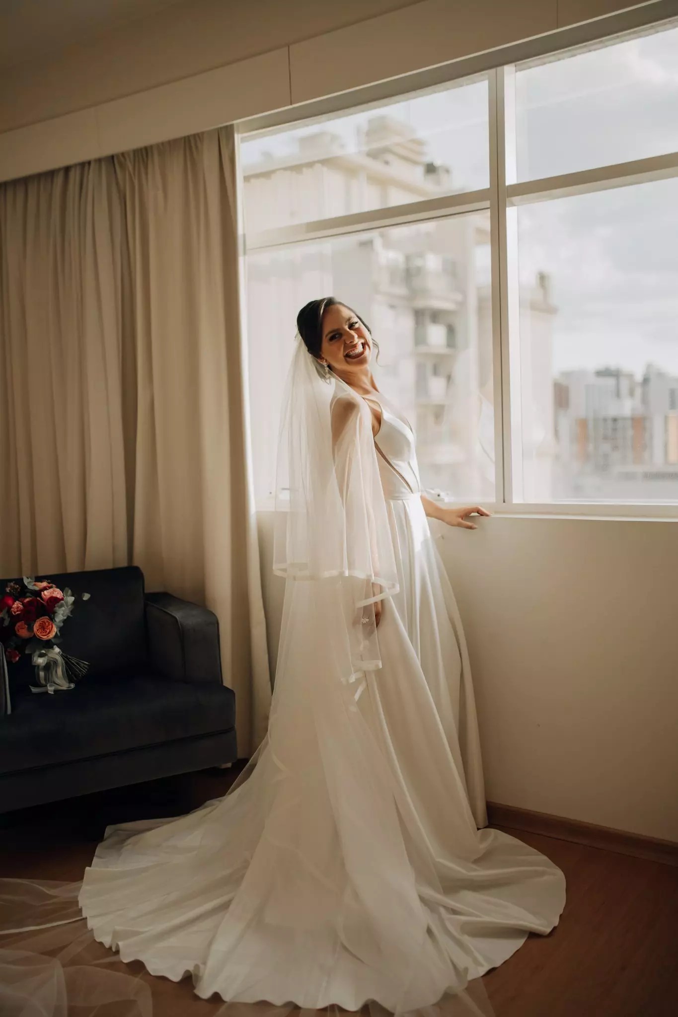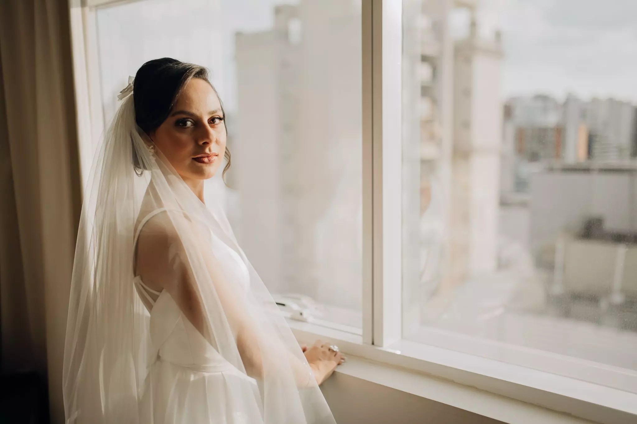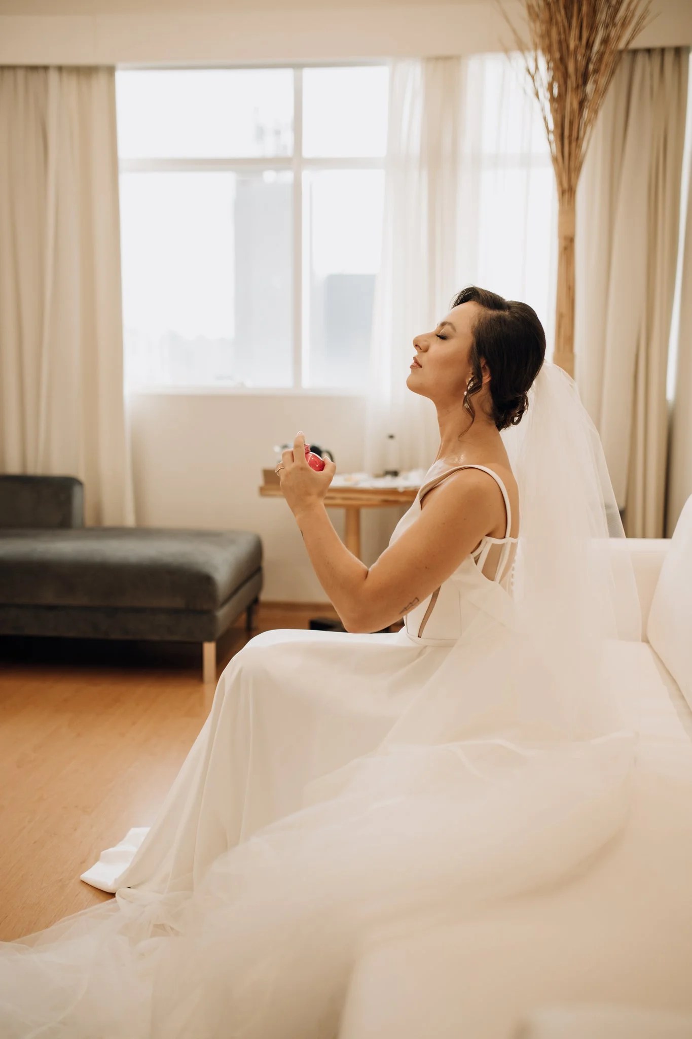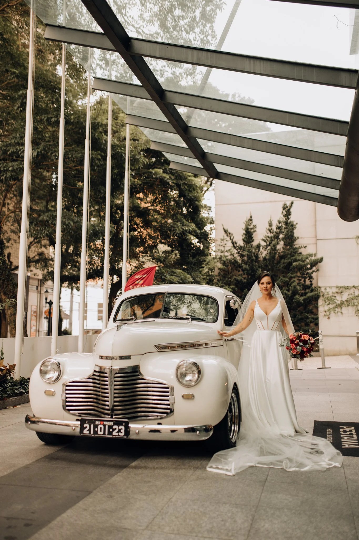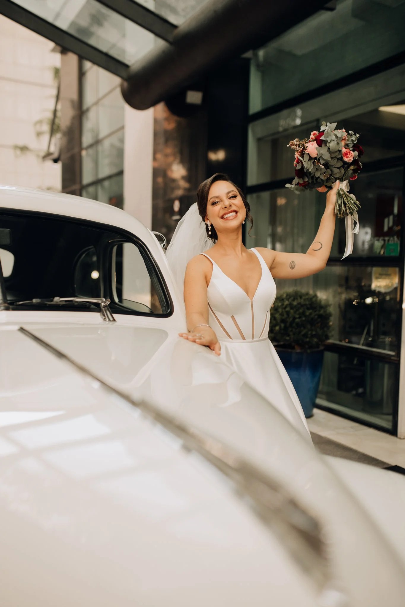 Ana ficou maravilhosa no Vestido Pérola, com recortes simétricos e transparência inesperadas, esse vestido clean transmite elegância. A sobre-saia do Pérola permite uma transformação em segundos de um vestido evasê para um sereia. Perfeito para as noivas que buscam uma troca de look para a cerimônia e a festa como fez a Ana.