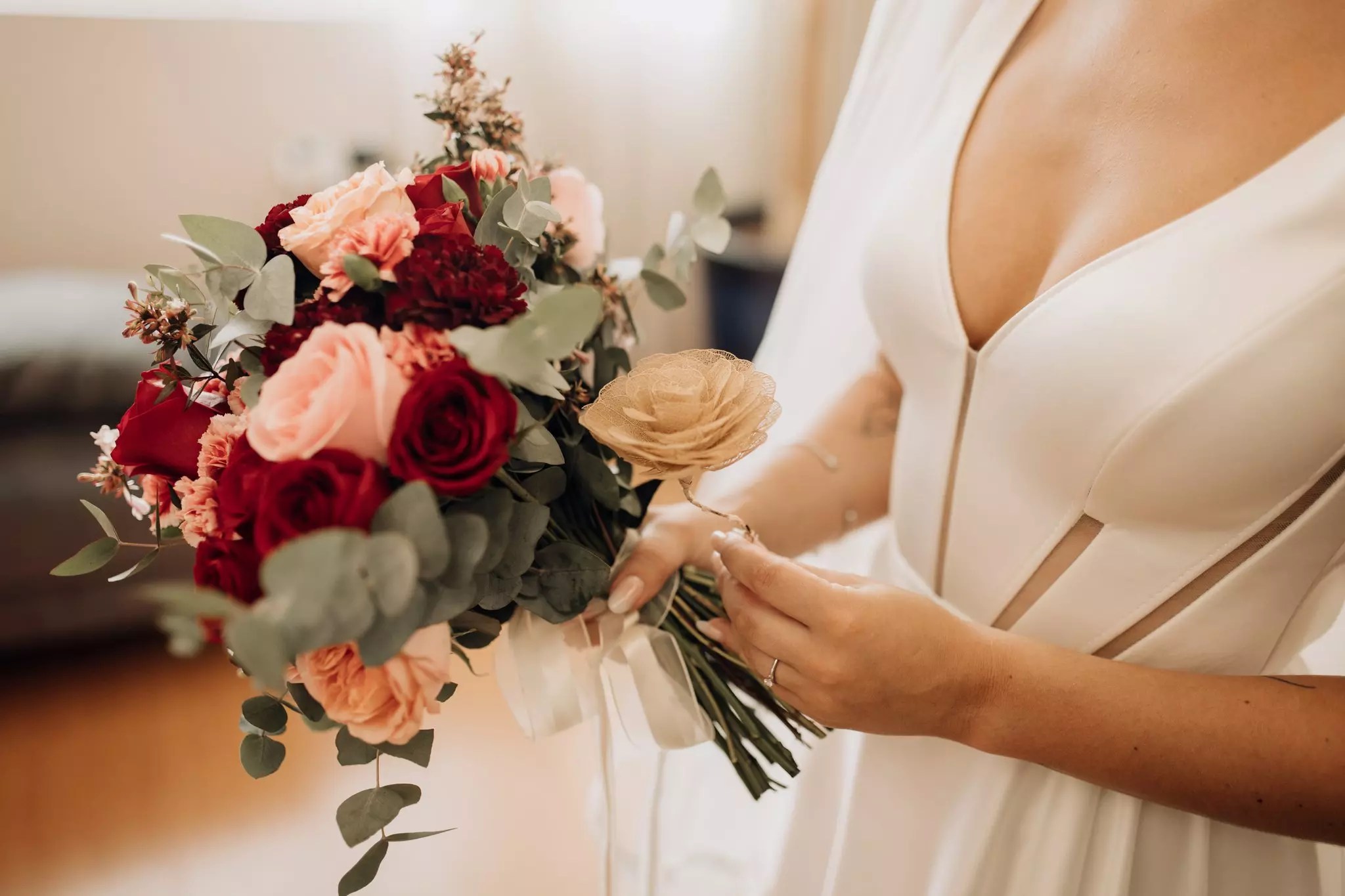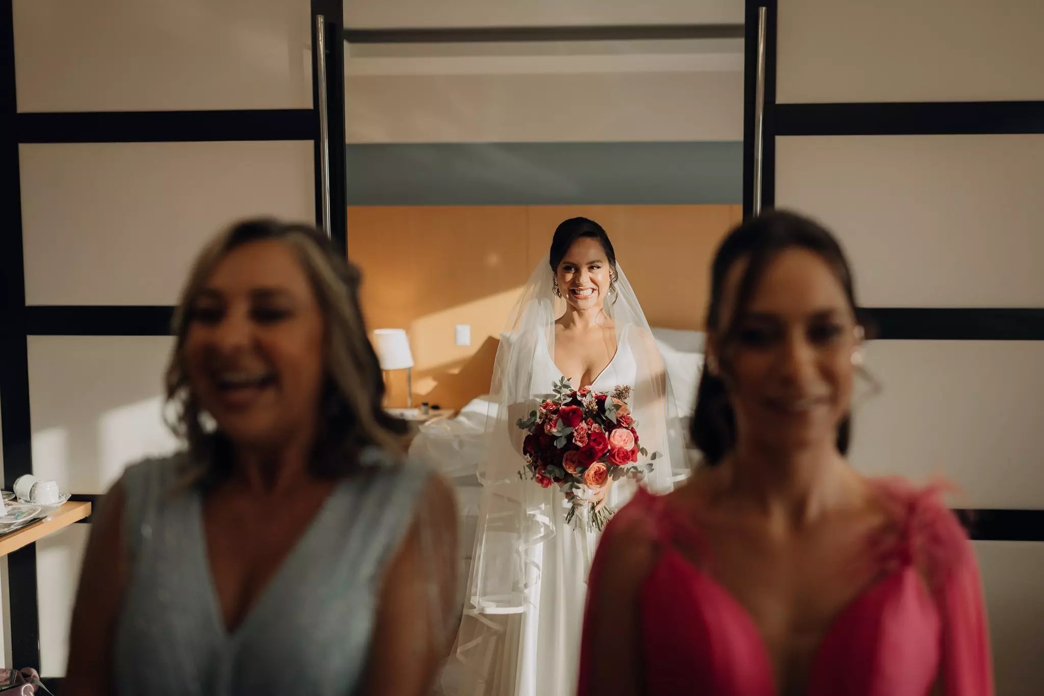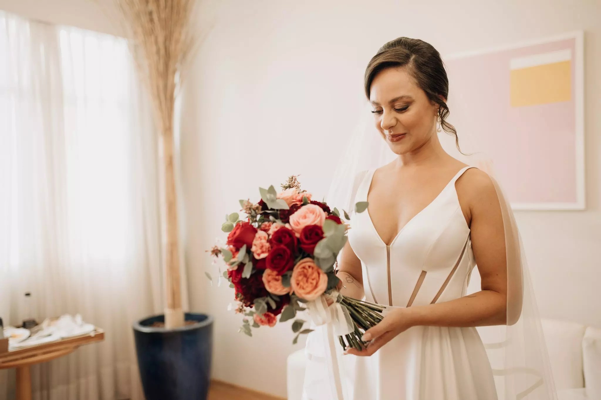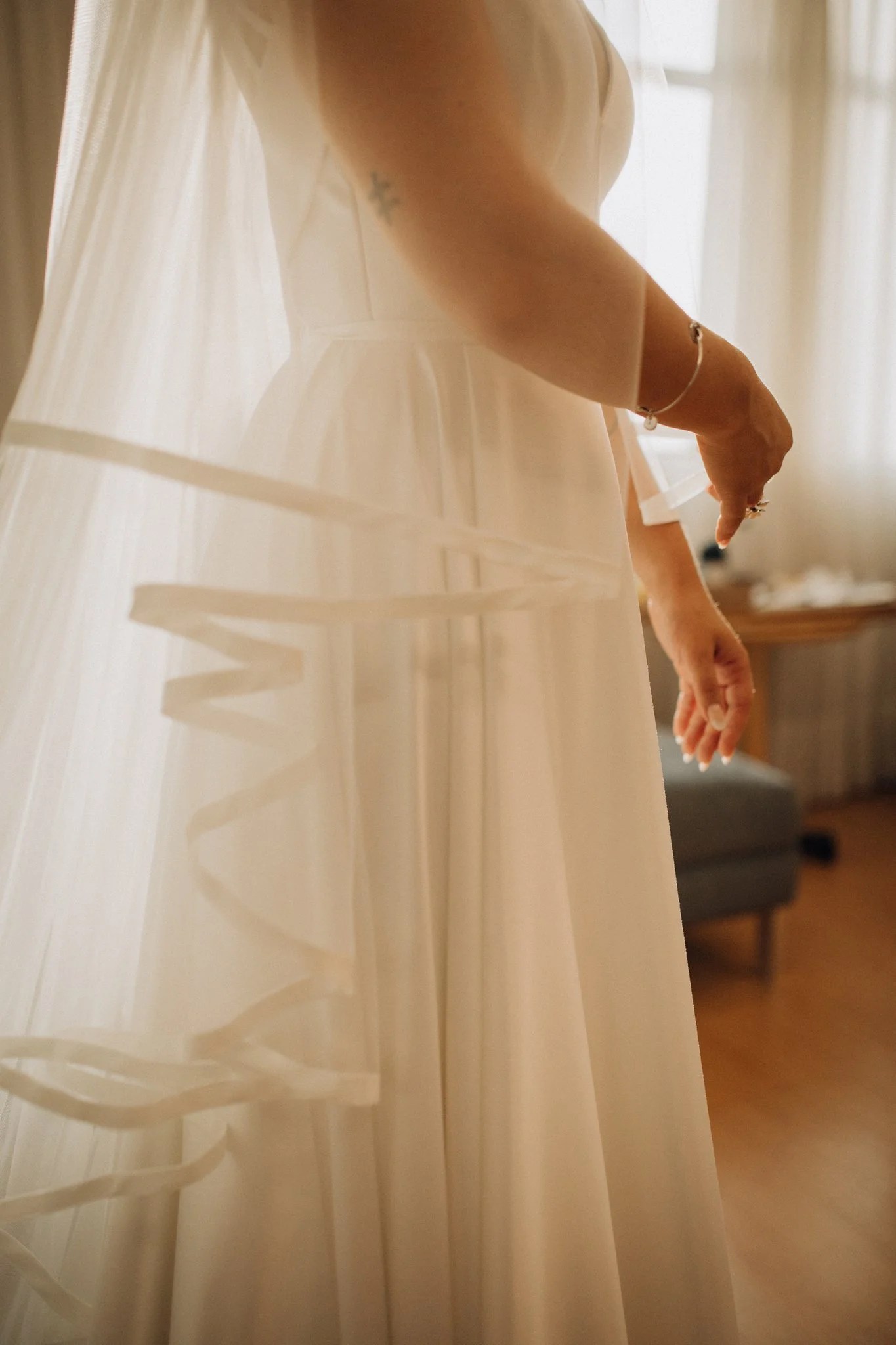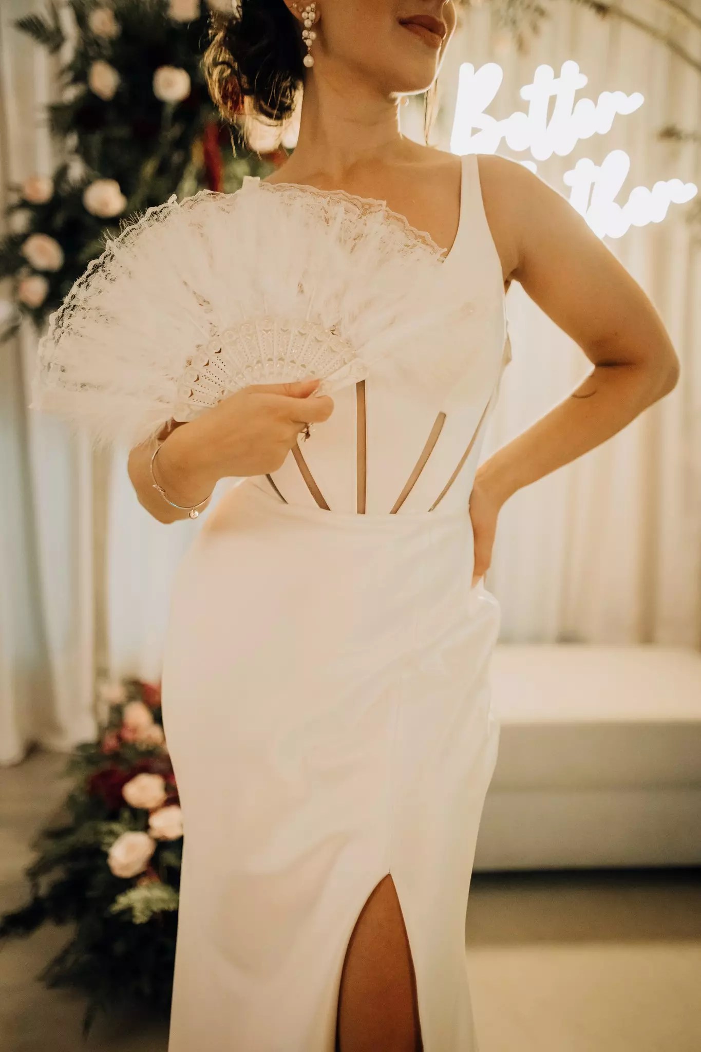 Ana ficou maravilhosa no Vestido Pérola, com recortes simétricos e transparência inesperadas, esse vestido clean transmite elegância. A sobre-saia do Pérola permite uma transformação em segundos de um vestido evasê para um sereia. Perfeito para as noivas que buscam uma troca de look para a cerimônia e a festa como fez a Ana.