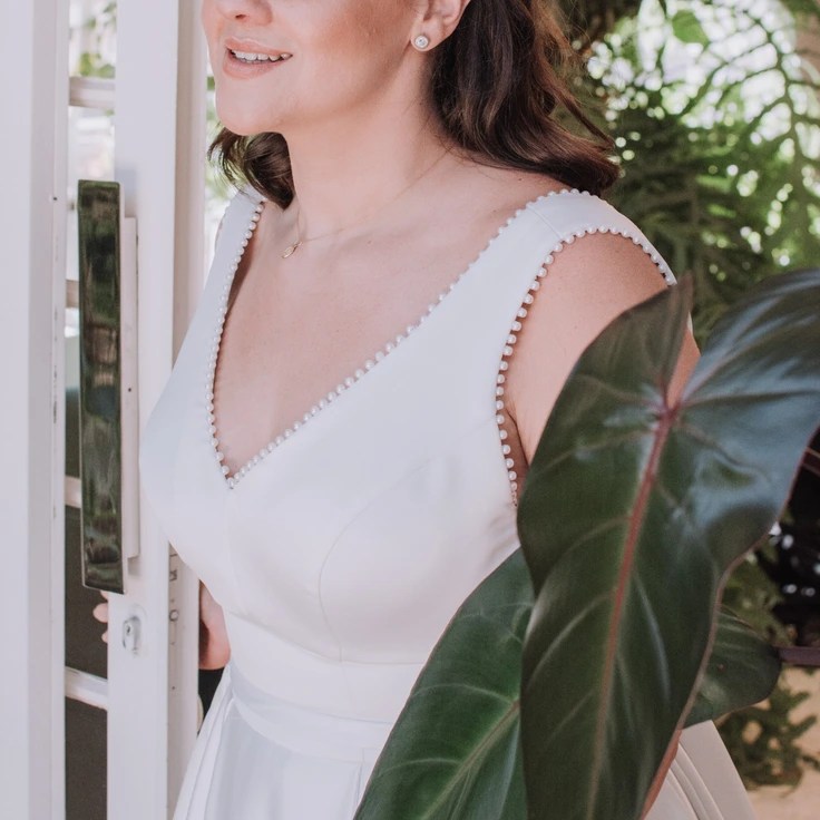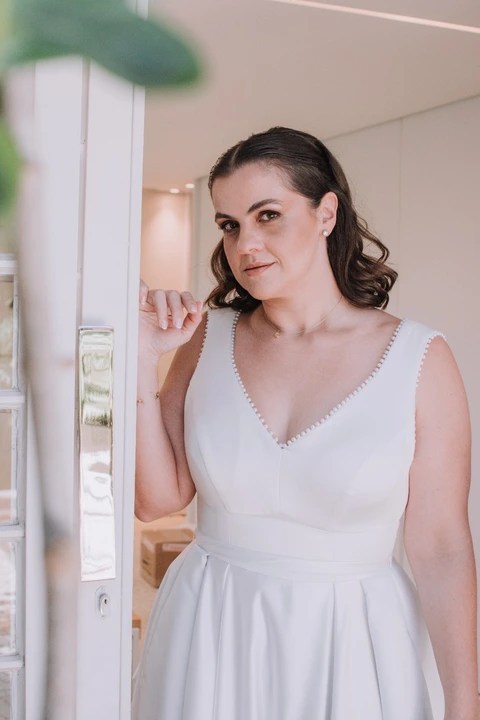 Vestido decote V com aplicações de pérolas no decote. Maxi laço removível nas costas. Saia em A com calda. Esta é uma peça original da Coleção NC: desenhada, produzida e bordada manualmente, no ateliê.