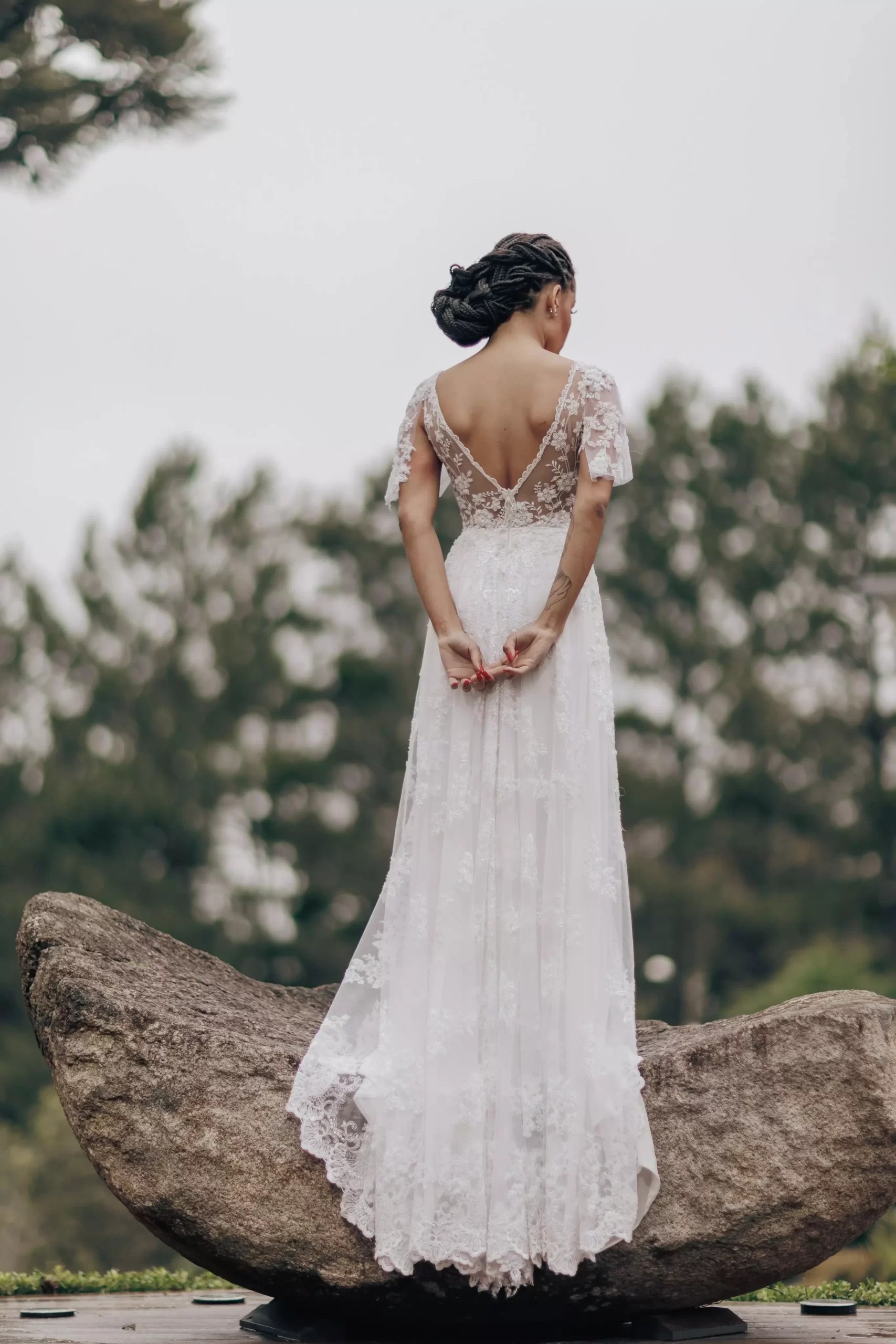 Vestido em renda floral delicadamente bordada, costas na transparência rendada, manga curta soltinha com renda aplicada e saia reta com cauda. Esta é uma peça original da Coleção NC: desenhada, produzida e bordada manualmente, no ateliê.